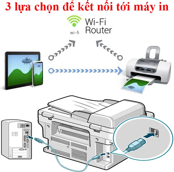 Có 3 cách chính để kết nối một máy in (không phải tất cả các máy in sẽ có cả 3 cách).